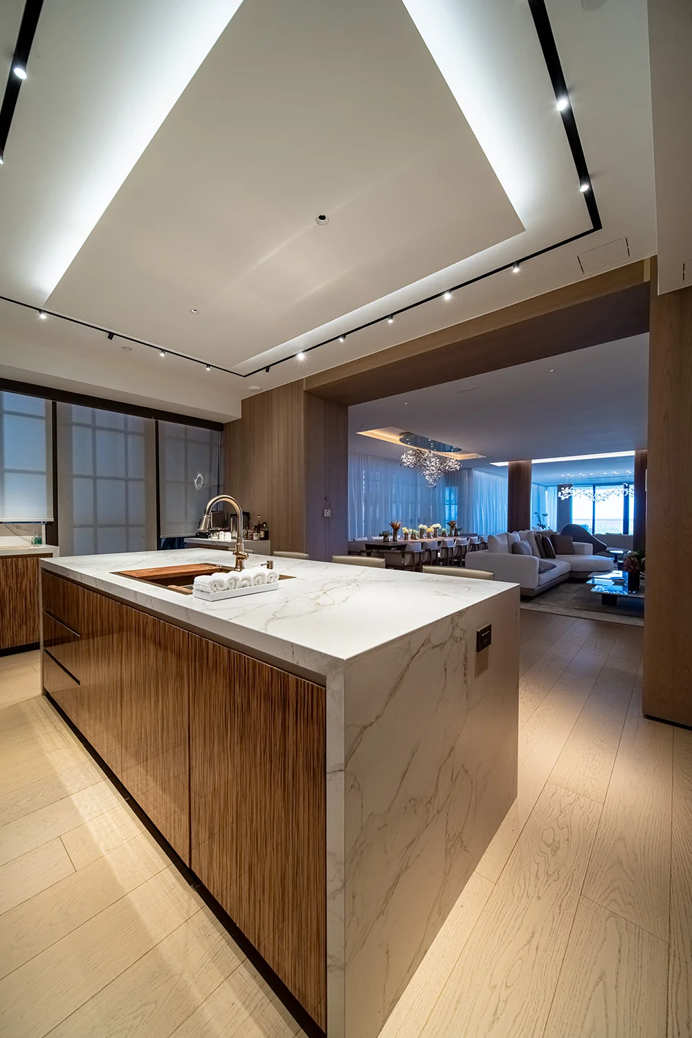 Rita Chraini unveils a full-scale renovation of a 7,000 sq ft penthouse at Artes Surfside, Miami—a residence where refined French sophistication is seamlessly blended with the serenity of oceanfront living. At the heart of the design lies a dramatic onyx bar with bespoke backlighting, creating a luminous focal point that anchors the main living space. Overlooking it, a handcrafted crystal chandelier by Sans Souci Lighting cascades gracefully through the staircase, functioning as both sculpture and light installation. Rita curated a selection of exceptional furnishings from Fendi Casa, Minotti by DDC, and Roche Bobois, shaping an interior that feels timeless, polished, and meticulously tailored. A standout moment is the iconic Louis Vuitton Cocoon hanging chair from the Objets Nomades collection—an avant-garde piece that introduces both artistry and movement, perfectly framing the penthouse's sweeping views of the Atlantic. The result is a residence of rare harmony—architectural precision, luxurious materials, and curated design elements brought together to create a coastal sanctuary of unmistakable elegance.